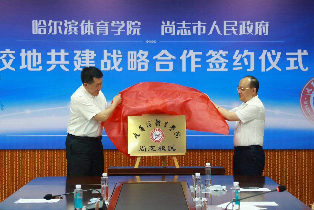 签约仪式后,兰景力与刘海涛共同为哈尔滨体育学院尚志校区揭牌。