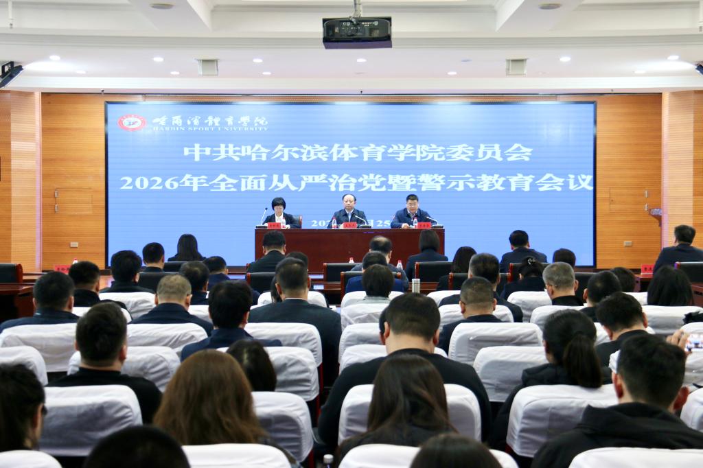 3月25日,哈尔滨体育学院召开2026年全面从严治党暨警示教育会议。会议坚持以习近平新时代中国特色社会主义思想为指导,深入学习贯彻二十届中央纪委五次全会、十三届省纪委五次全会精神和全省教育系统全面从严治党工作会议要求,回顾2025年工作成效,分析形势任务,部署2026年重点工作。校党委书记、校长姜玉洪出席会议并讲话,校纪委书记、监察专员李柃燕作纪检监察工作报告。会议由校党委副书记王春雷主持。