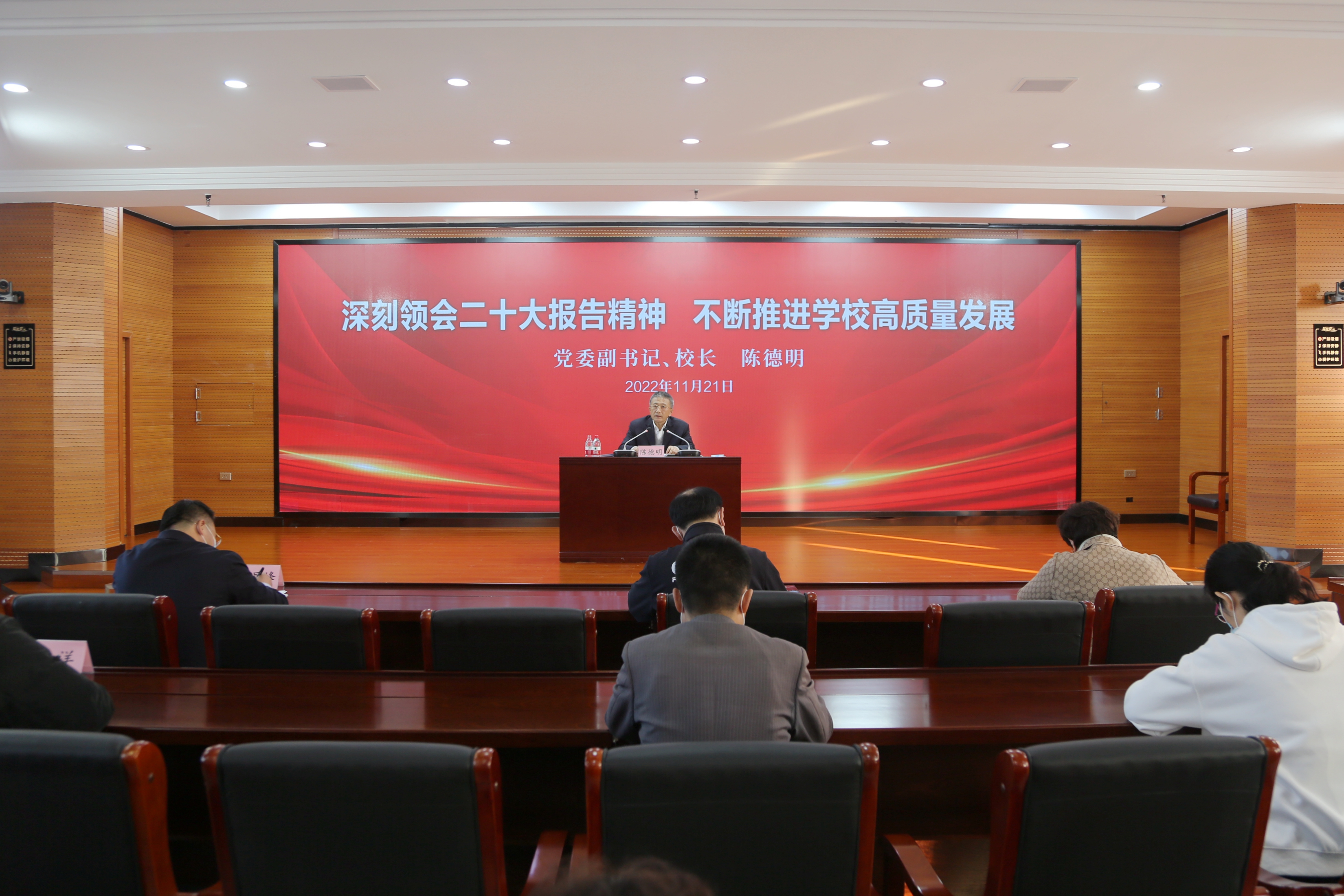宣讲会上,陈德明从二十大报告开辟马克思主义中国化时代化新境界、牢牢把握高质量发展这个首要任务、奋力吹响加快建设体育强国的时代号角、以“三个第一”为引领不断推进学校高质量建设与发展、以“体医体卫融合”新理论新实践不断书写全面健康新篇章五个方面作了系统宣讲和深入阐释,令与会同志在深入理解二十大精神的同时,又清楚明晰了自身在体育强国建设和促进学校高质量发展过程中的使命和任务。