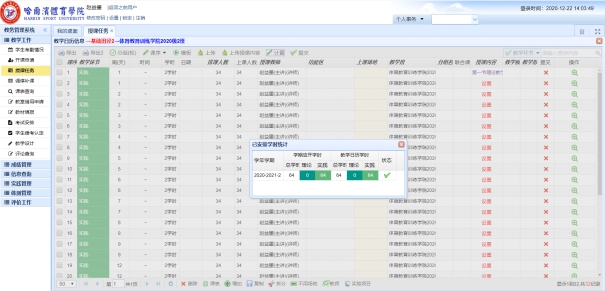 打开浏览器,在地址栏输入http://210.46.216.43/,账号为教师工号,初始密码为hty工号#。之后,首先点击左边菜单栏中中的“授课任务”,在 授课任务 界面 选择相应的学年学期等查询条件,系统列出授课任务,如下图所示。